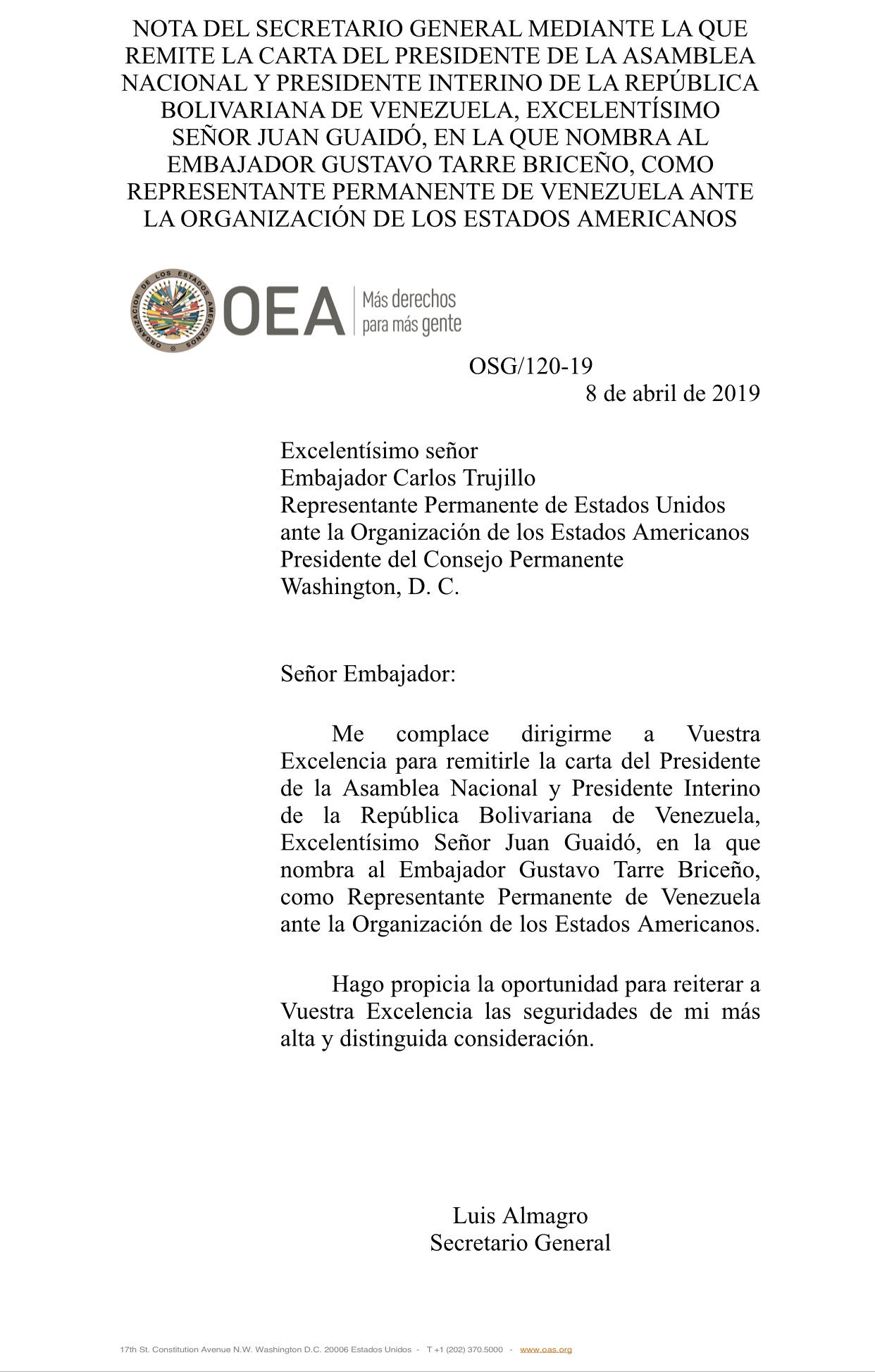 OEA: 1) Resolución del 09-04-2019 , 2) Salida de Venezuela